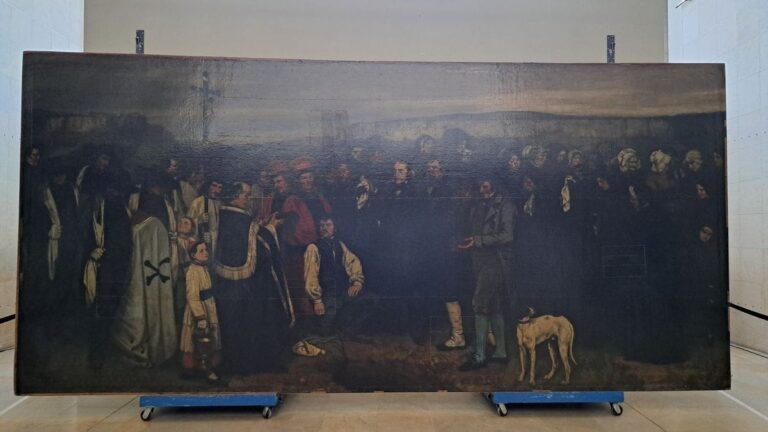 C’est un chantier hors normes pour une œuvre tout aussi monumentale. Ce mardi 6 mai, le musée d’Orsay a officiellement lancé la restauration d’Un enterrement à Ornans, chef-d’œuvre de Gustave Courbet peint entre 1849 et 1850. Le tableau de près de sept mètres de long sur trois de haut, figure majeure de la collection du musée parisien, n’avait pas connu de restauration fondamentale depuis un demi-siècle.