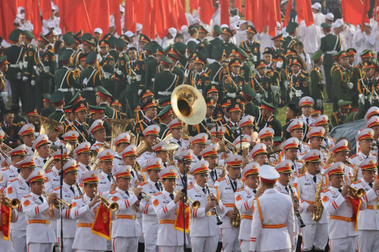 Le défilé a mis en avant les équipements militaires les plus modernes du pays, tels que des hélicoptères russes Mi-171, des avions de chasse Sukhoï Su-30, ainsi que des drones de fabrication locale. En mer, des sous-marins russes de classe Kilo et des frégates ont également participé aux célébrations. Des milliers de soldats vietnamiens ont défilé aux côtés de détachements militaires venus de Chine, de Russie et d’autres pays, soulignant la dimension internationale donnée à l’événement.