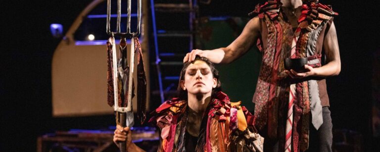 La mise en scène de Laurent Domingos prend des partis clairs : version resserrée du texte en 1h30, intégration d’improvisations, bande-son électro qui pulse comme un cœur battant entre chaque scène, esthétique de fin du monde. Le théâtre de Shakespeare n’en ressort que d’autant plus brut, organique, urgent. Le punk de cette mise en scène ne se veut pas provocation gratuite, mais miroir du chaos intérieur de la pièce. Et comment ne pas évoquer les incroyables costumes de Delphine Ciavaldini ? Ingénieux assemblages de cravates multicolores formant robes, capes, gilets, chapeaux spectaculaires, ou manchons, ils ajoutent un cachet indéniable à la pièce.