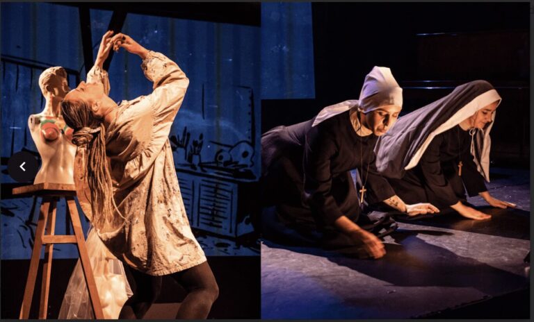 La scénographie mêle théâtre, chant, danse, musique et projections de dessins au fusain, qui esquissent en filigrane les lieux de l’histoire : l’atelier, le couvent, la boîte de nuit… Cette poésie visuelle accompagne délicatement les deux comédiennes dans leur traversée intérieure.