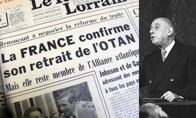 Le 7 mars 1966, le président Charles de Gaulle annonce au président américain Lyndon B. Johnson la sortie de la France du commandement intégré de l’OTAN. Cette décision, qui s’inscrit dans une politique de souveraineté nationale, vise à libérer la France de la tutelle militaire américaine tout en restant membre de l’Alliance atlantique. Elle entraîne le départ des troupes américaines et canadiennes du territoire français et le transfert du siège de l’OTAN de Paris à Bruxelles. Pour de Gaulle, il s’agit de refuser toute subordination stratégique à Washington et d’affirmer l’autonomie de la défense nationale, notamment par le développement de la force de frappe nucléaire française.