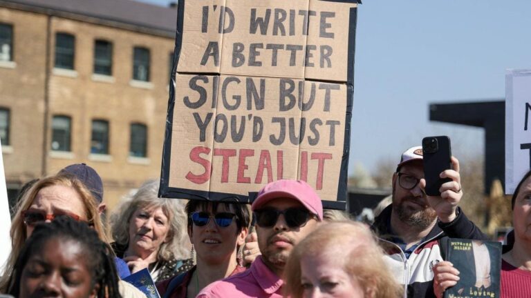 Les manifestants ont scandé : « Meta, Meta, voleuse de livres !» , brandissant des pancartes dénonçant Mark Zuckerberg, le PDG de l’entreprise.