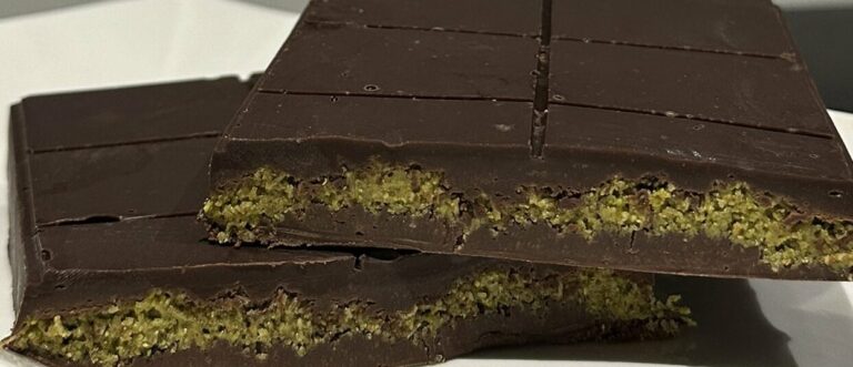 Cette barre de chocolat renferme en fait un fourrage à base de crème de pistache, de knafeh et de tahini, ces sortes de cheveux d’ange sucrés et croustillants bien connus au Moyen-Orient.