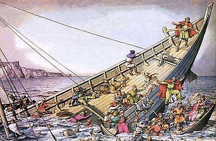 Alors que le vent forcit et que la mer devient sombre, Guillaume presse le pilote de rattraper rapidement le navire de son père. La Blanche Nef s’engage alors dans un passage dangereux, bordé de récifs affleurants. En un instant, la coque se déchire sur les rochers de Quillebœuf. Le navire se remplit d’eau et sombre avant que quiconque ait le temps de lancer les chaloupes. Seuls deux hommes survivent en s’agrippant à la vergue : un jeune noble et un simple boucher de Rouen, Bérold, qui sera le seul rescapé retrouvé à l’aube.
