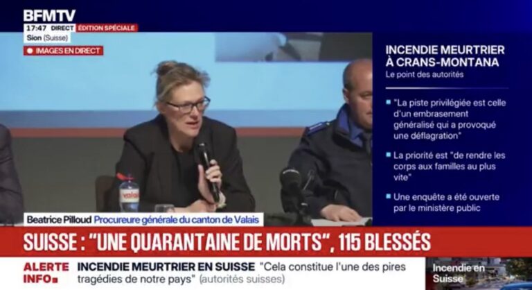 Le procureur général du Valais, Béatrice Pilloud, a précisé que de vastes moyens étaient mobilisés pour identifier les victimes et restituer leurs corps aux familles. Le conseiller d’État en charge de la sécurité, Stéphane Ganzer, a confirmé qu’une déflagration avait été constatée, mais qu’elle était consécutive à l’embrasement général du bar. Les autorités excluent pour l’heure toute piste criminelle ou terroriste et privilégient un accident.