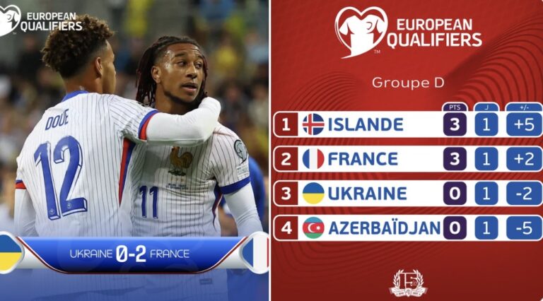 Avec ce succès, la France reste au contact de l’Islande, leader provisoire du groupe après sa large victoire contre l’Azerbaïdjan (5-0). Les Bleus se tourneront désormais vers leur prochain rendez-vous mardi face aux Islandais, déjà annoncé comme un duel important pour prendre la tête de la poule.