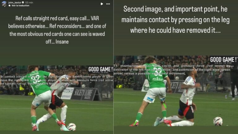 Le match avait déjà été interrompu sur une faute grossière de l’attaquant des Verts Lucas Stassin sur Corentin Tolisso. L’arbitre François Letexier sort le carton rouge, décision logique. La VAR lui fait bizarrement revenir sur sa décision.