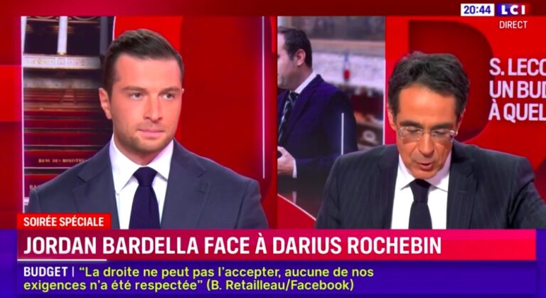 Invité de Darius Rochebin ce mercredi 15 octobre sur LCI, Jordan Bardella a estimé que la motion de censure contre le gouvernement de Sébastien Lecornu « se jouera à quelques voix ». Le président du Rassemblement national, confiant, a assuré que « la balle est dans le camp des députés LR et PS ». Pour lui, si l’Assemblée « retrouve un peu de courage », le gouvernement pourrait tomber dès jeudi.
