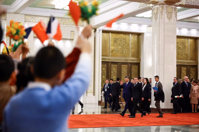 En visite d’État à Pékin pour la quatrième fois, Emmanuel Macron a appelé jeudi le président chinois Xi Jinping à renforcer la coopération géopolitique, commerciale et environnementale, alors que l’Union européenne sollicite le soutien de Pékin pour favoriser une sortie de crise en Ukraine. Le chef de l’État français arrive accompagné d’une large délégation d’entreprises, dans l’espoir de sécuriser plusieurs accords économiques et de redonner un élan international à son action politique à deux ans de la présidentielle de 2027.