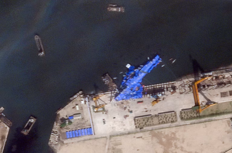 Des images satellites obtenues par le Centre d’études stratégiques et internationales (CSIS), basé à Washington, confirment l’ampleur des dégâts : on y voit le navire couché sur le côté, partiellement échoué, avec sa proue toujours sur la cale et sa poupe tournée vers le port, dissimulée sous des bâches bleues. Ces clichés suggèrent un dysfonctionnement structurel majeur lors de la mise à l’eau.