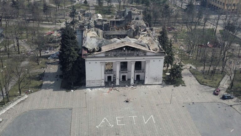 Une enquête menée par l’Associated Press avait établi par la suite que l’attaque avait tué environ 600 personnes à l’intérieur et aux abords du théâtre, soit près du double des premières estimations officielles. Au moment de la frappe, des centaines de civils s’étaient réfugiés dans le bâtiment après des semaines de bombardements intensifs. Le mot « enfants » avait été peint en grandes lettres sur la chaussée devant le théâtre, visible depuis les airs et par satellite.