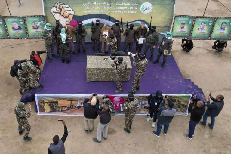 La mise en scène orchestrée par le Hamas avant leur libération a suscité l’indignation en Israël. Les otages ont été transportés dans des pick-up et exhibés sur un podium, lors d’une cérémonie organisée par des combattants du mouvement islamiste à Deir al-Balah, au centre de la bande de Gaza. La scène, retransmise en direct, a choqué les familles des otages, qui continuent d’exiger la libération de tous les captifs encore détenus à Gaza.