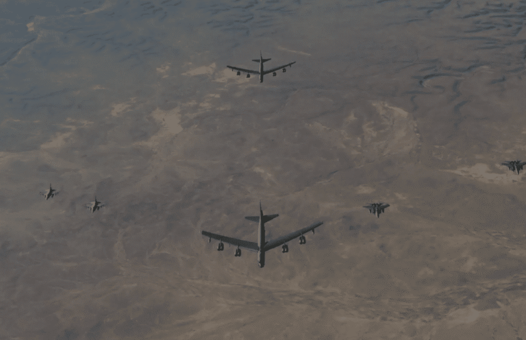Elle a ajouté dans un communiqué : « Deux avions B-52 ont décollé de la base aérienne britannique de Fairford, traversé l’Europe en survolant neuf pays partenaires dans la zone d’opération du commandement central américain, lors de cette mission qui a inclus des ravitaillements en vol et des largages de munitions réelles sur des terrains de tir dans plusieurs pays partenaires.