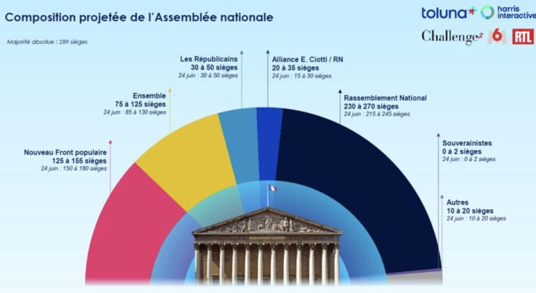 Selon la dernière projection réalisée par Toluna Harris Interactive pour RTL, M6 et Challenges, le Rassemblement national (RN) continue de progresser en vue des élections législatives anticipées de 2024. Avec 34% des intentions de vote, le parti de Marine Le Pen et Jordan Bardella domine les sondages et pourrait obtenir entre 230 et 270 sièges à l’Assemblée nationale, se rapprochant ainsi de la majorité absolue fixée à 289 sièges.