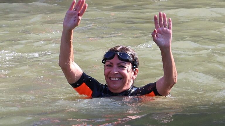 Paris Mayor Anne Hidalgo (R) swims in the Seine River, in Paris on July 17, 2024, to demonstrate that the river is clean enough to host the outdoor swimming events at the Paris Olympics later this month. Despite an investment of 1.4 billion euros ($1.5 billion) to prevent sewage leaks into the waterway, the Seine has been causing suspense in the run-up to the opening of the Paris Games on July 26 after repeatedly failing water quality tests. But since the beginning of July, with heavy rains finally giving way to sunnier weather, samples have shown the river to be ready for the open-water swimming and triathlon -- and for 65-year-old Hidalgo. (Photo by EMMANUEL DUNAND / AFP)